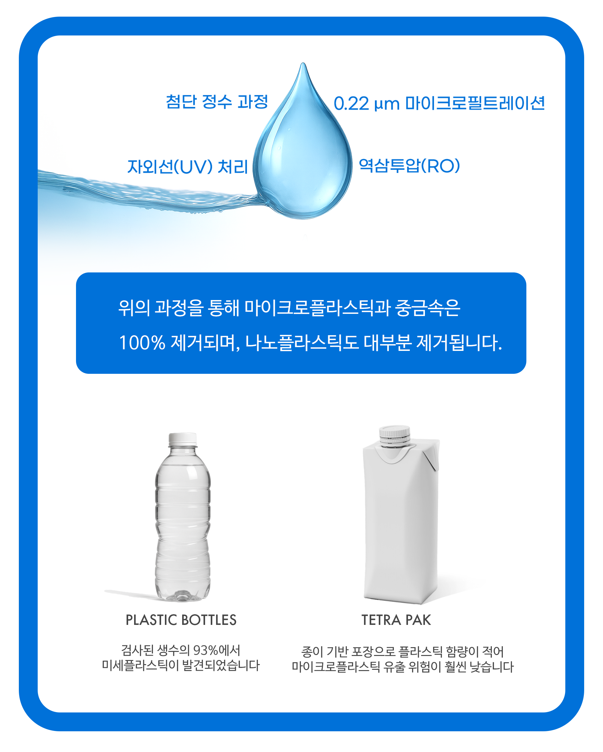 Tetra Pak® 카톤 팩은 PET 플라스틱 병과 달리 음료에 접촉하는 플라스틱 비율이 훨씬 적습니다. 카톤의 70% 이상은 종이 기반으로, FSC 인증을 받은 친환경 소재를 사용하며, 내부에 얇은 보호층만 적용해 미세플라스틱 용출 가능성을 최소화합니다. 이는 장기간 보관 시에도 음료에 녹아 들어갈 수 있는 플라스틱 잔류량이 적어 인체가 노출되는 미세플라스틱 양을 크게 줄이는 효과가 있습니다. 또한 무균(aseptic) 포장 기술로 냉장 없이도 안전하게 보존할 수 있으며, 재활용이 용이한 설계로 환경과 건강을 동시에 지키는 포장 솔루션을 제공합니다.